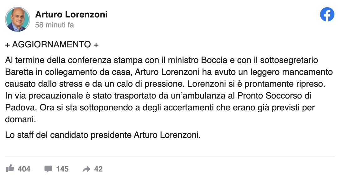 Il video in cui Lorenzoni avverte il malore, il candidato era in diretta Facebook, è stato prontamente rimosso dal social. La disavventura per Lorenzoni è avvenuta quando erano le 13 circa: il candidato alle regionali per il centrosinistra dopo 50 minuti di conferenza stampa si è accasciato a terra nel suo studio. I figli del candidato se ne sono accorti e hanno chiamato il 118.