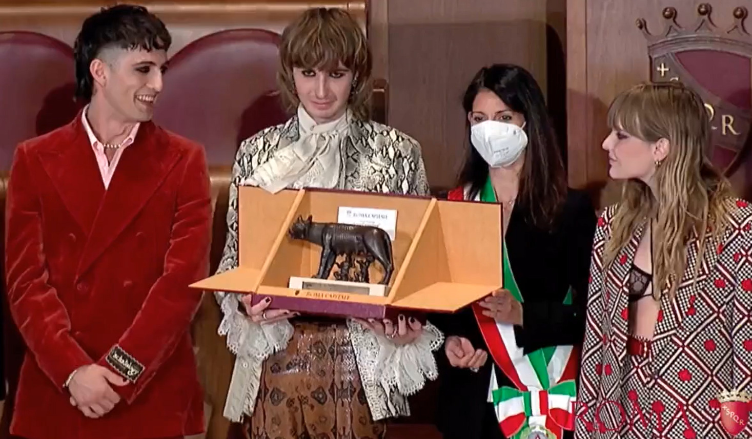 Una sfilata tra i sanpietrini per salire al Campidoglio, dove ad attenderli c’era la sindaca di Roma Virginia Raggi. I Maneskin, la rock band che ha scalato le vette delle classifiche dopo la vittoria del Festival di Sanremo prima e dell’Eurovision poi, sono stati accolti nell’aula Giulio Cesare in Campidoglio per la cerimonia di consegna della Lupa capitolina, il riconoscimento che Roma Capitale tributa a personaggi illustri e artisti particolarmente meritevoli.