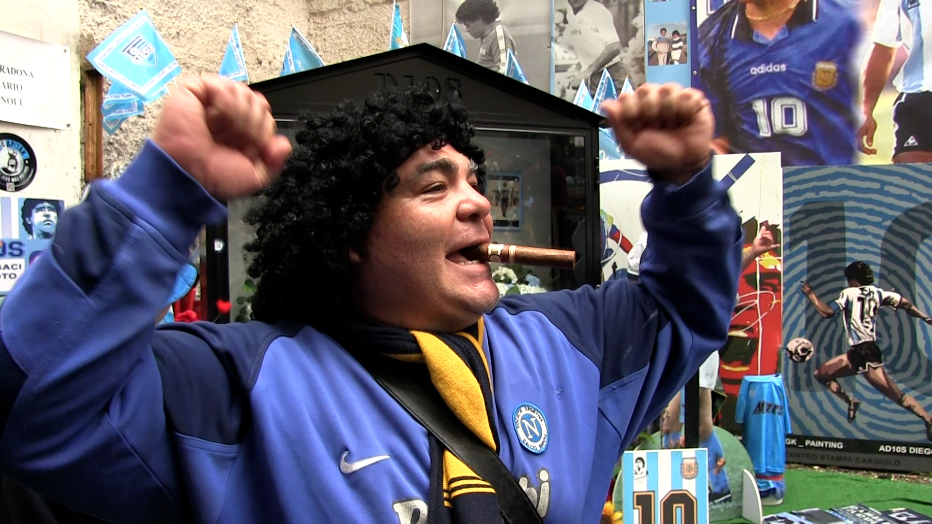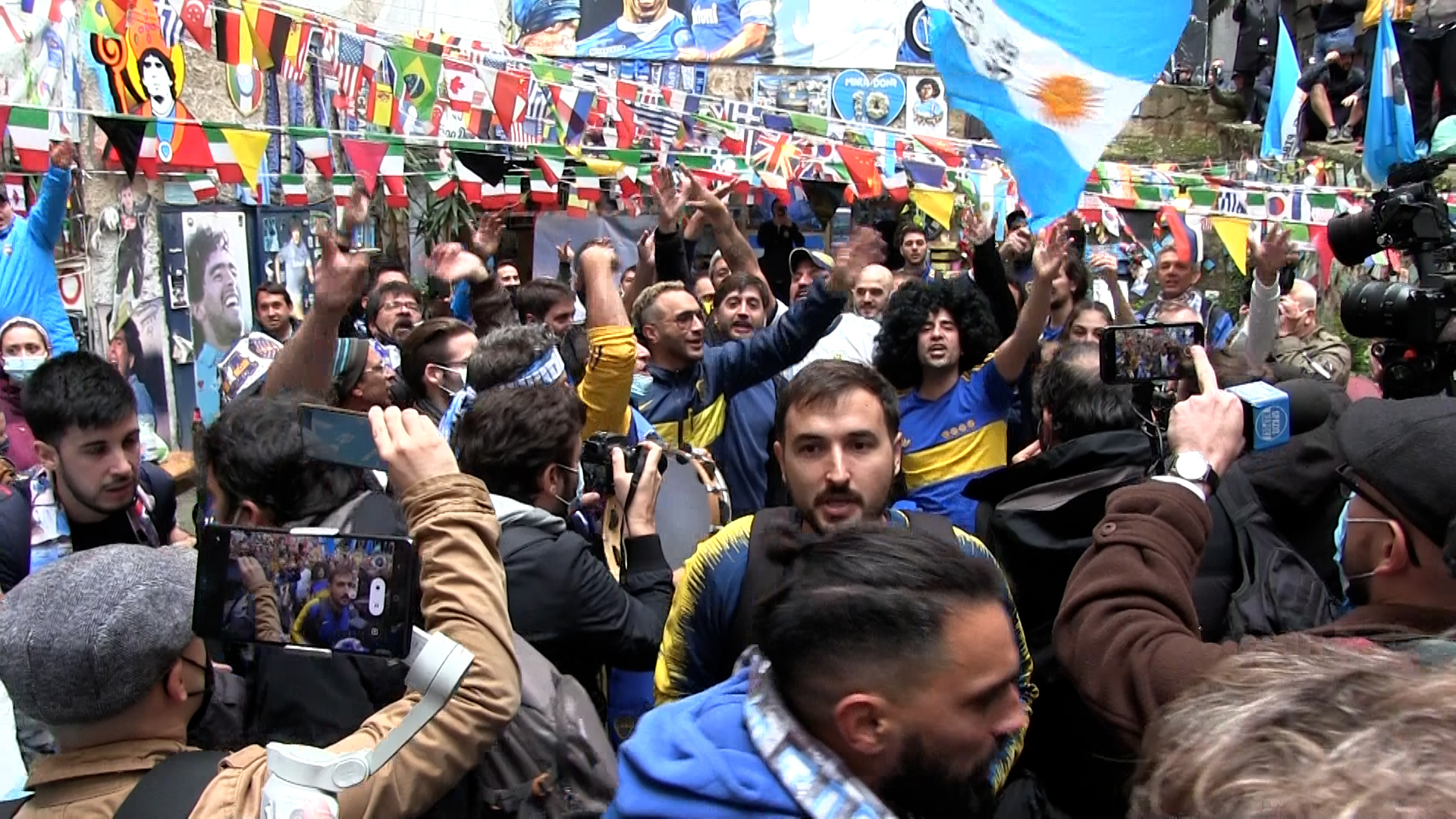 Jorge si commuove tirando fuori una fotografia che dice essere inedita, delle celebrazioni in campo dopo la vittoria al Mondiale del 1986. Qualcuno indossa una parrucca come quella del “pelusa”. All’azzurro Napoli, colore dominante, si aggiunge il gialloblù dei bosteros. Qualche sosia attira l’attenzione dei fotografi. Si appendono stendardi e bandiere. La consegna di magliette celebrative dei consulados. La gente dai balconi si affaccia sulla piazza diventata ormai un punto di riferimento del culto del campione a Napoli. E canta: canta cori da curva e canzoni dedicate al Pibe. Un bandonéon intona tango e La Mano de Dios di Rodrigo Bueno, la colonna sonora della giornata. Per più di qualche momento saltano le mascherine anti-covid.