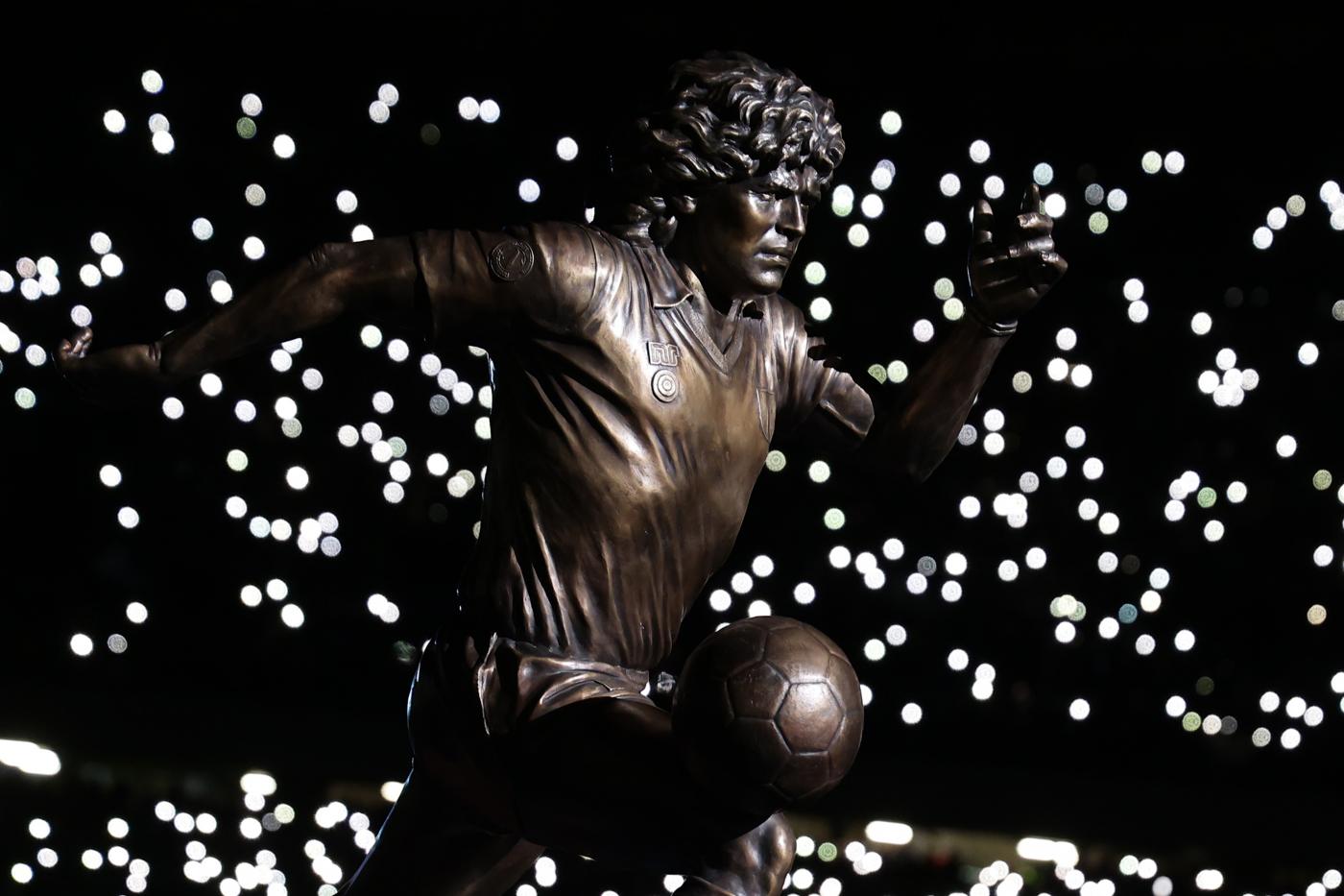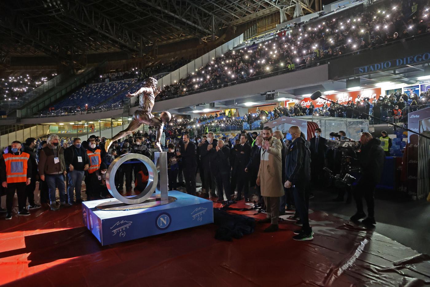 Ieri la scena era tutta per la seconda statua, quella realizzata dalla Fonderia Nolana per volere di Stefano Ceci, manager e amico di Maradona, un dono al Napoli e a Napoli. Altezza: un metro e 67 centimetri. Peso: 72 chili. Proprio come il campione argentino. Il piede e la mano sinistra ricoperte d’oro. Il monumento è stato scoperto circa un’ora prima del fischio di inizio e portato come in processione sulla pista d’atletica. Luci spente, migliaia di cellulari dei tifosi accesi, recitato dall’attore Gianfranco Gallo una lettera per Maradona firmato dallo scrittore Maurizio De Giovanni. “La verità è che non te ne sei mai andato – le parole – Da quel pomeriggio di luglio, quando salisti questi gradini e uscisti nel sole e nell’amore di ottantamila pazzi di te, stretti da ore nel caldo solo per sorriderti. Ti guardasti attorno e lo capisti in un attimo, che questa era la tua erba e la tua luce, perché i grandi amori se sono veramente grandi si sentono sulla pelle del cuore”.