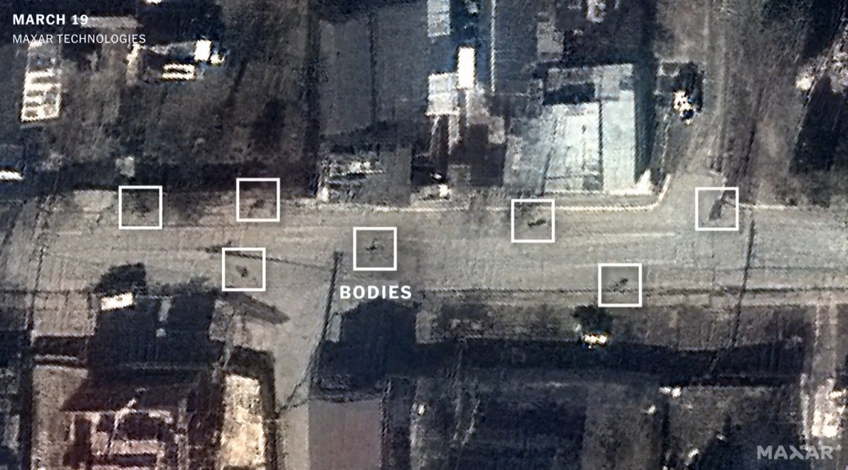 E quindi dalle immagini satellitari si vedono almeno undici cadaveri abbandonati per strada “risalenti all’11 marzo, quando le truppe russe avevano il controllo del centro”. Il Visual Investigations team del New York Times riporta che le persone uccise sarebbero state abbandonate in strada per più di tre settimane. “Le cause della morte non sono chiare – scrive il quotidiano americano – alcuni dei corpi erano accanto a quello che sembra essere un cratere da impatto, altri erano vicino ad auto abbandonate, tre dei corpi giacevano accanto alle bicilette, alcuni hanno le mani legate dietro la schiena con un panno bianco”.