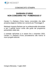 Tittavia, contratto dell’artista è in essere fino a dicembre 2023. Canale 5 e Barbara D’Urso procederanno pertanto “alla ricerca di nuovi progetti editoriali”, che vedranno coinvolta l’artista. Scatta, dunque, il totonomi, in attesa di sapere chi prenderà il posto dell’amata conduttrice.
