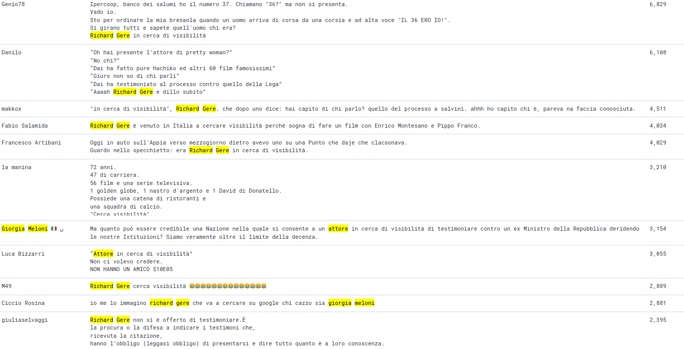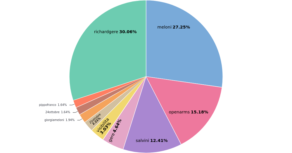 Sul fronte degli argomenti trattati, Gere e Meloni si contendono il primato, mentre i protagonisti Salvini e Open Arms guardano nei posti successivi insieme a Pippo Franco nelle ultime fila della topten per via del tweet di Fabio Salamida che ha ironizzato sulla venuta di Richard Gere “venuto in Italia a cercare visibilità perché sogna di fare un film con Enrico Montesano e Pippo Franco” che ricorda mena rimmel “è stato proposto dalla Meloni come assessore a Roma”.