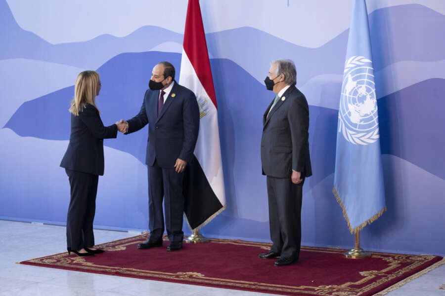 Il presidente egiziano, assieme al segretario generale dell’Onu Antonio Guterres, ha accolto così il premier italiano all’International Convention Center di Sharm el-Sheikh per la cerimonia inaugurale degli incontri di alto livello della Cop27, la conferenza sul clima delle Nazioni Unite.