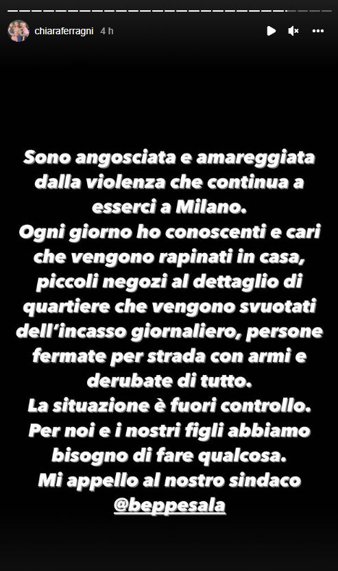 L’influencer Chiara Ferragni ha condiviso una storia allarmata e preoccupante su Instagram. Una storia in cui racconta di una Milano “fuori controllo” dal punto di vista della sicurezza. Rapine, furti, aggressioni per strada. “Sono angosciata e amareggiata dalla violenza che continua ad esserci a Milano”, ha scritto l’influencer seguita da oltre 27 milioni e mezzo di follower, lanciando un appello al sindaco Beppe Sala.