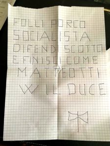 “Folli porco socialista difendi scotto e finisci come Matteotti. W il duce”. Sono queste le parole scritte su un foglio di quaderno a quadretti, in stampatello, recapitate a Maurizio Folli, avvocato fiorentino e segretario provinciale del Partito Socialista italiano. Un messaggio di minaccia non firmato ma che finisce con il disegno del fascio littorio.