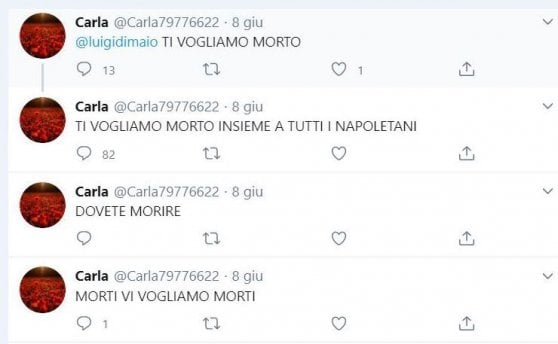 “Ti vogliamo morto insieme a tutti i napoletani”. È l’escalation di violenza verbale comparsa sui social in queste ore contro il ministro degli Esteri Luigi Di Maio. Un account anonimo registrato come “Carla” ha minacciato l’ex capo politico in un crescendo di messaggi intimidatori: “Ti vogliamo morto”, “Ti vogliamo morto insieme a tutti i napoletani”, “Dovete morire”, “Morti vi vogliamo morti”.