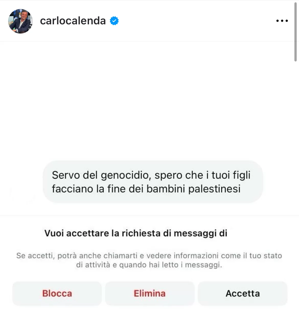 “Servo del genocidio, spero che i tuoi figli facciano la fine dei bambini palestinesi“. Una frase inquietante, minacciosa, quella ricevuta da Carlo Calenda. Il leader di Azione ha postato sui suoi social uno dei diversi messaggi che nelle ultime ore gli sono arrivati, a seguito di un suo intervento in tv sul tema Israele e del conflitto a Gaza.
