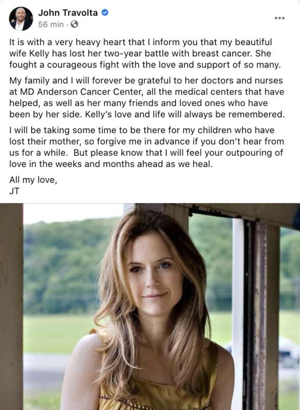 “Io e la mia famiglia saremo sempre grati ai dottori gli infermieri dell’MD Anderson Cancer Center, tutti i centri medici che ci hanno aiutato così come ai suoi tanti amici e persone care che sono sempre stati con lei. L’amore e la vita di Kelly saranno sempre nei nostri ricordi”, ha scritto ancora Travolta, prima di annunciare una pausa dal lavoro per elaborare il lutto.