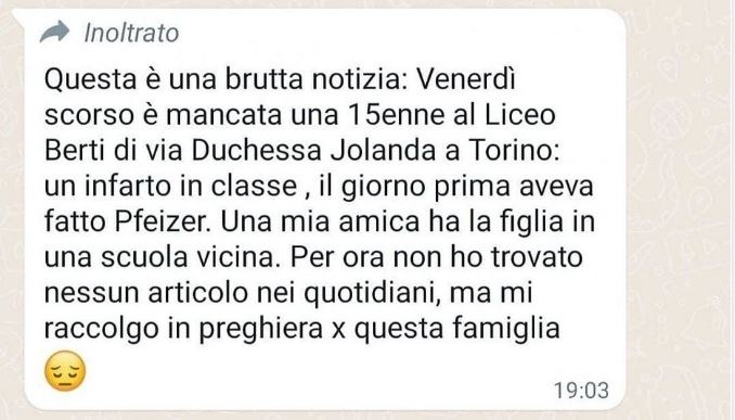 Nei giorni successivi al decesso ha iniziato a girare vorticosamente tra WhatsApp e altri social network lo screenshot di un messaggio in cui vi è scritto questo: “Questa è una brutta notizia: Venerdì scorso è mancata una 15enne al Liceo Berti di via Duchessa Jolanda a Torino: un infarto in classe, il giorno prima aveva fatto Pfizer. Una mia amica ha la figlia in una scuola vicina. Per ora non ho trovato nessun articolo nei quotidiani, ma mi raccolgo in preghiera x per questa famiglia”.