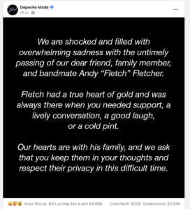“Siamo scioccati e pieni di tristezza per la prematura scomparsa del nostro amico, membro della famiglia e della band Andy ‘Fletch’ Fletcher” si legge sul post pubblicato sui canali social della band. “Fletch aveva un cuore d’oro e c’era sempre quando avevi bisogno di supporto, di una vivace chiacchierata, di una buona risata o una pinta fresca. Il nostro cuore è con la sua famiglia, e vi chiediamo di tenerlo nei vostri pensieri e di rispettare la loro privacy in questo momento così difficile”.
