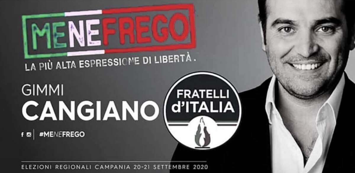 Un motto dal chiaro rimando fascista come ‘claim’ della sua campagna elettorale in vista delle elezioni regionali del prossimo settembre. È quello utilizzato dal candidato di Fratelli d’Italia in Campania Gimmi Cangiano. L’esponente casertano del partito di Giorgia Meloni ha scelto infatti lo slogan “Me ne frego”, notoriamente fascista, per la sua campagna elettorale a sostegno del candidato governatore del centrodestra Stefano Caldoro.