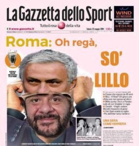 La prima pagina della Gazzetta dello Sport con Lillo che si toglie la maschera da Josè Mourinho è tra le più condivise sui social così come le immagini di Diletta Leotta (che i gossip dicono legata al Ryan Friedkin) con la scritta “Diletta facci comprare Neymar“. Notevole anche il cambio di soprannome alla romana: “Da Special One a Special Aho. Un attimo”.
