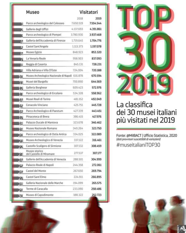 La Top 30 dei musei e dei parchi archeologici statali del 2019 regala conferme e novità, con il podio stabilmente occupato dal Colosseo, con oltre 7,5 milioni di visitatori, le Gallerie degli Uffizi, con quasi 4,4 milioni di ingressi, e Pompei, con circa 4 milioni di presenze. Seguono la Galleria dell’Accademia di Firenze e Castel Sant’Angelo, realtà che da molti anni occupano la cima della classifica della Top 30. Tra i primi cinque istituti, in termini assoluti da segnalare la crescita di Pompei che vede aumentare di 160.000 unità i biglietti staccati nei soli scavi. Lo rivela il ministero per i Beni e le attività culturali e per il turismo in una nota.