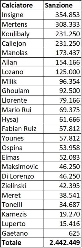 Multe che partono dal 5% e arrivano fino al 25% dello stipendio mensile lordo di ogni singolo calciatore, per un totale di circa 2,5 milioni di euro che De Laurentiis, decurtandole dalle buste paga dell’ultimo stipendio, riporterà nelle casse della società. Si va dagli oltre 300mila euro di Insigne e Mertens, che pagano di più probabilmente per una questione legata agli introiti maggiori che percepiscono per i diritti d’immagine, ai 230mila di Callejon e Koulibaly. I quattro big arrivano così a versare quasi la metà dell’importo totale. La cifra più bassa riguarda invece Gianluca Gaetano, proveniente dalla Primavera, sanzionato con 625 euro. Non figura nel libro dei ‘cattivi’ il terzino Kevin Malcuit, infortunatosi nelle settimane precedenti l’ammutinamento.
