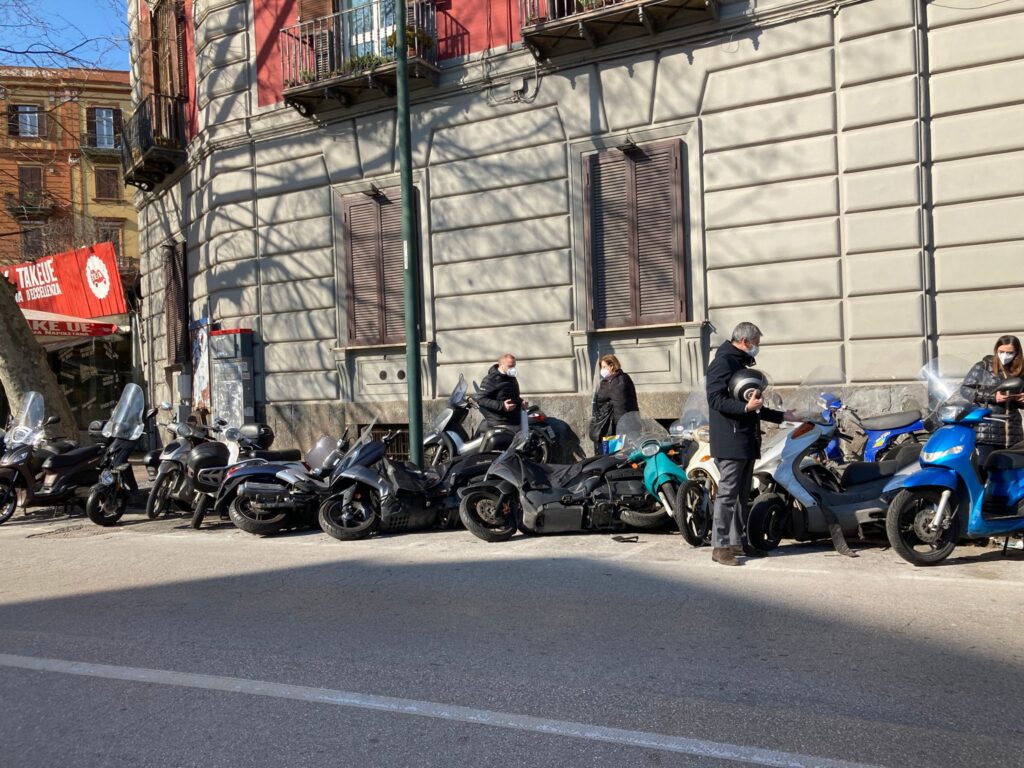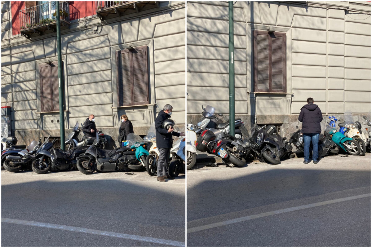 Sette motorini parcheggiati lungo la strada sono stati travolti e abbattuti da un’auto che poi è fuggita via. Attimi di paura si sono vissuti nel primo pomeriggio di lunedì 22 febbraio lungo il Corso Vittorio Emanuele a Napoli.