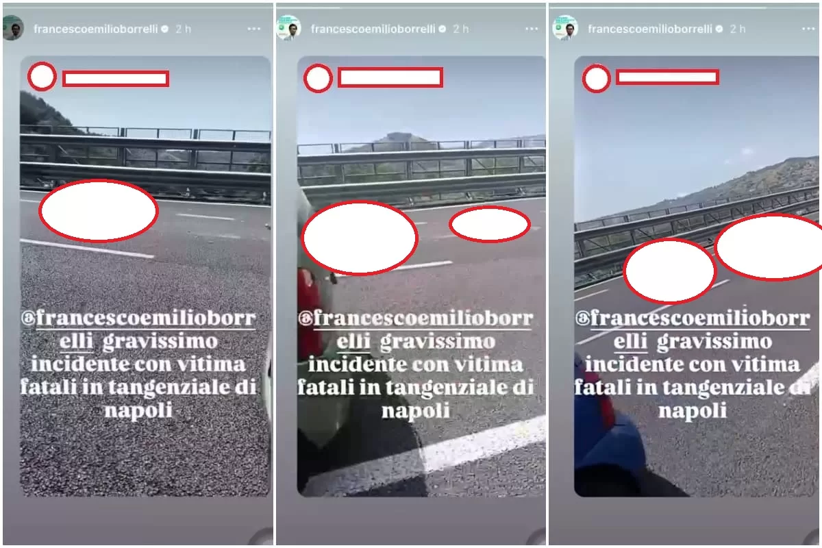 Immagini strazianti quelli a cui hanno assistito gli automobilisti che percorrevano la Tangenziale (l’incidente è avvenuto alle 12.50). Qualcuno ha avuto il barbaro coraggio di immortalare la scena in un video, condividerlo sui social e inviarlo allo stesso Borrelli che, senza filtri, ha pubblicato tutto tra le sue storie. Tra l’altro i nomi delle due vittime non sono stati ancora diffusi dopo il drammatico incidente. Nel breve filmato parenti e amici potrebbero riconoscere l’uomo e la donna che hanno perso la vita da dettagli, abbigliamento o altri particolari. Questo ovviamente Borrelli lo ignora perché l’importante è essere ovunque.