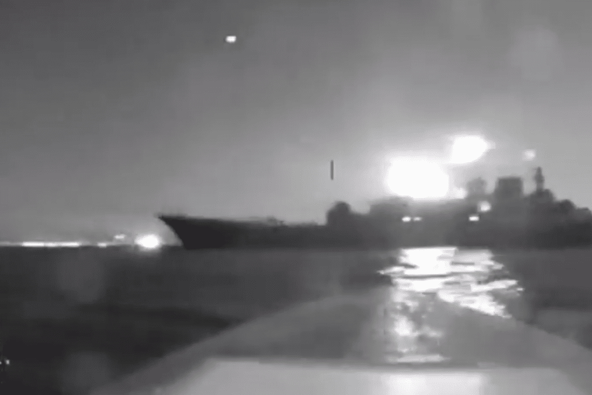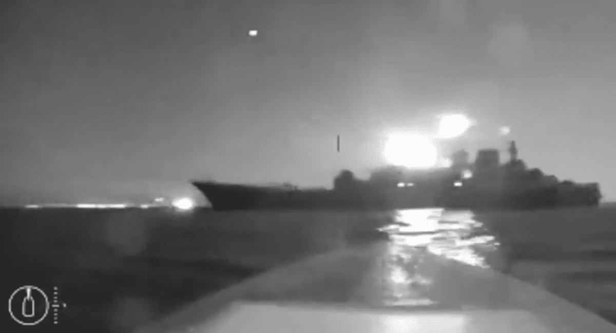 Uno dei video mostra in prima persona ciò che sembra essere un drone marittimo che colpisce il fianco di una nave, mentre un altro video mostra la nave inclinata su un fianco.