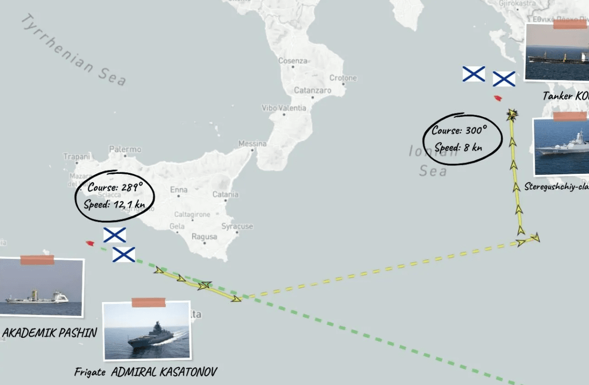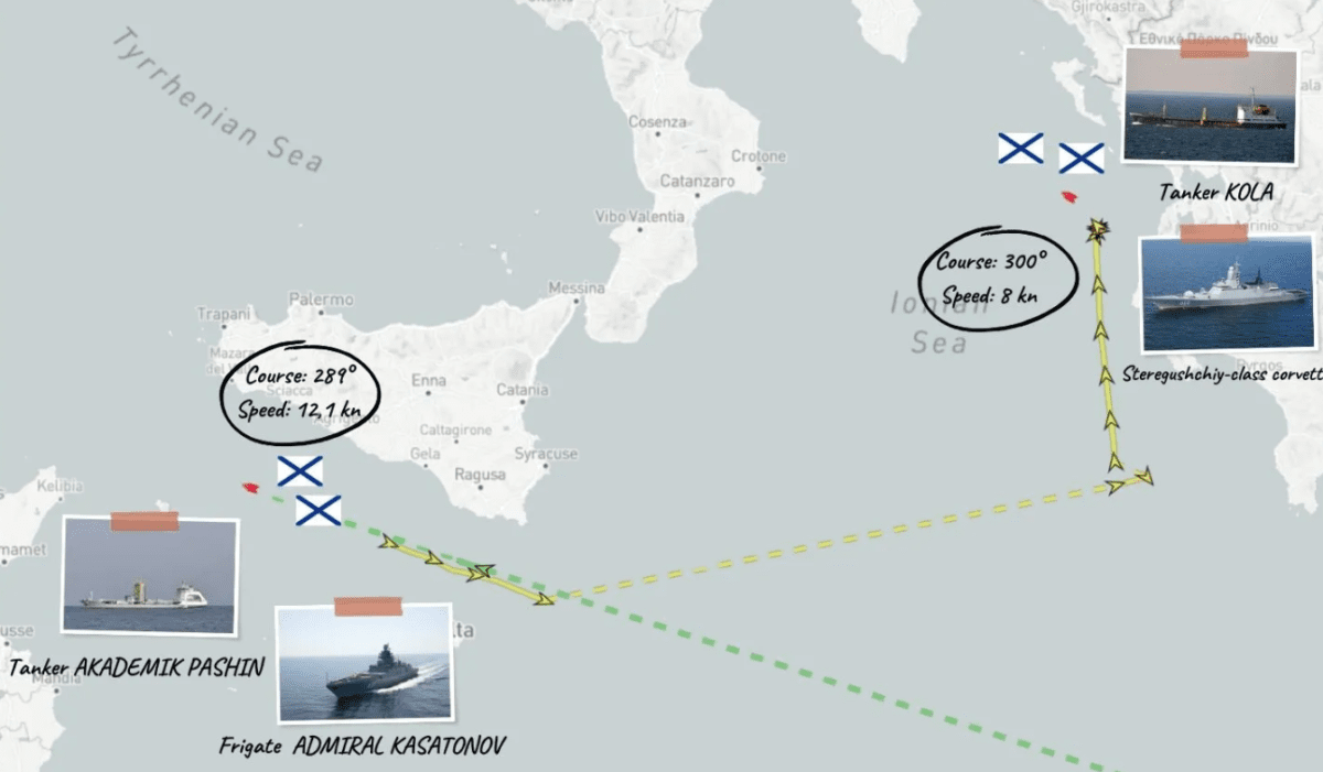 Itamilradar riferisce della presenza del tanker (navi cisterna, petroliere) ‘Akademik Pashin‘ e della fregata ‘Ammiraglio Kasatonov‘ che stanno navigando attualmente nel Canale di Sicilia provenienti dal porto siriano di Taurus e dirette verso l’Atlantico, attraverso lo Stretto di Gibilterra, per poi tornare in Russia. La ‘Pashin’ e la Kasatonov’ potrebbero esssere presto sostituite dal tanker ‘Kama’ e dalla fregata ‘Ammiraglio Gorshkov’ che entreranno a breve nel Mediterraneo attraverso il canale di Suez.
