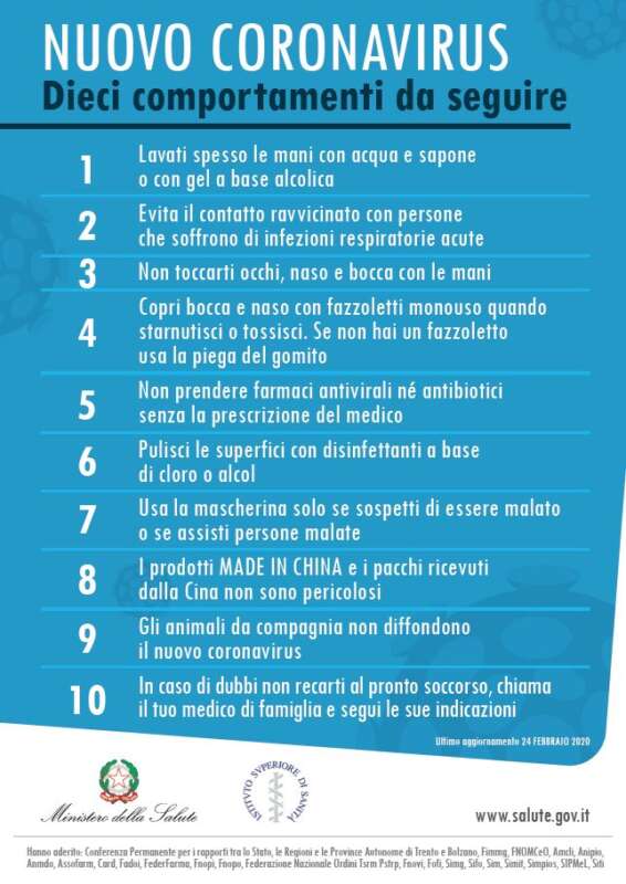 Tra le nuove regole: evitare abbracci e strette di mano, mantenere la distanza di almeno due metri dalle altre persone, evitare luoghi affollati. Agli Over 65 viene chiesto espressamente di rimanere in casa e di uscire il meno possibile. Si valuta anche la possibilità di sospendere per trenta giorni tutte le manifestazioni, incluse quelle sportive. Gli eventi, quindi, potrebbero essere rinviati o disputati a porte chiuse. In sintesi, gli italiani dovranno cambiare “stile di vita” per almeno 30 giorni.