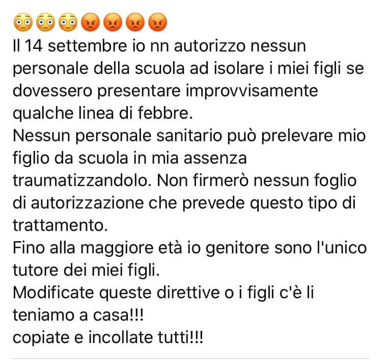 Questo il testo della bufala diventata virale: “Il 14 Settembre io nn autorizzo nessun personale della scuola ad isolare mia figlia se si dovesse presentare improvvisamente qualche linea di febbre. Nessun personale sanitario può prelevare mio figlio da scuola in mia assenza traumatizzandola. Nn firmerò nessun foglio di autorizzazione che prevede questo tipo di trattamento. Fino alla maggiore età io genitore sono unico tutore di mio figlio. Modificate queste direttive o i figli c’è li teniamo a casa!!!!! Copia e incolla sul tuo profilo, se anche tu la pensi come me”.