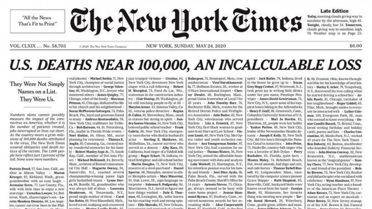 Il New York Times lo fa dedicando la sua prima pagina alle vittime americane del coronavirus, proprio mentre il bilancio statunitense si prepara a scivolare pericolosamente verso le 100mila vittime “una perdita incalcolabile“.