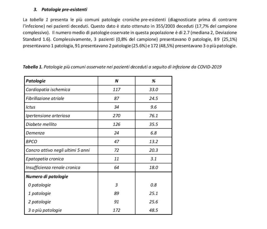 I morti per l’influenza cosiddetta stagionale sono, mediamente, in Italia, 8mila all’anno. L’82% dei casi gravi e il 97% dei decessi presentano almeno una patologia cronica preesistente. Non si deve dimenticare poi che la principale causa di morte in assoluto sono le malattie del sistema cardiocircolatorio: 638 persone ogni giorno. C’è poi il problema del concorso di patologie. L’Iss ha provveduto a pubblicare una casistica – vedi la tabella in alto – da cui risulta che molti decessi riguardano persone sofferenti di altre gravi patologie pre-esistenti.