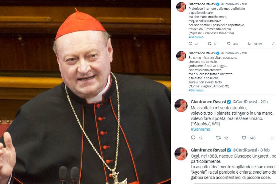 Ieri dopo aver ricordato la nascita del poeta Giuseppe Ungaretti (di cui propone il testo Agonia, commentando “evadiamo dal perimetro della nostra gabbia”), Ravasi pubblica brani di testi sanremesi che sembrano averlo colpito. Ad esempio quello di Will “Ma a volte io mi sento stupido, volevo tutto il pianeta stringerlo in una mano, volevo fare il poeta, ora l’essere umano” o degli Articolo 31 “Non volevamo crescere, ma è successo tutto a un tratto e fai tutte le cose che giuravi non avresti fatto”. Per finire con le liriche di Colapesce e Dimartino “Preferisco il rumore delle metro affollate a quello del mare. Ma che mare, ma che mare, meglio soli su una nave per non sentire il peso delle aspettative”.