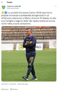 L’attuale allenatore della Carrarese e la sua famiglia sono scossi ma sono rimasti illesi. Il club, intanto, si è stretto affianco al suo allenatore con una nota ufficiale: “La società Carrarese Calcio 1908 esprime la propria vicinanza e solidarietà stringendosi in un affettuoso abbraccio a Mister Antonio Di Natale ed alla sua famiglia a seguito della vile rapina subita la scorsa notte nella propria abitazione”.