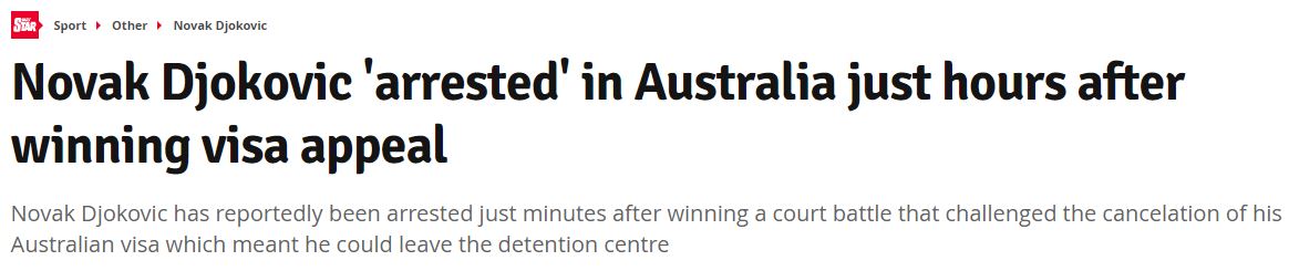 Non mancano di certo le sorprese nell’intricata vicenda di Novak Djokovic. Il tennista serbo numero uno al mondo, subito dopo aver vinto la prima battaglia in tribunale a Melbourne, col giudice Anthony Kelly che ha restituito a ‘Nole’ il passaporto e dunque la possibilità di restare ‘Down Under’ e disputare così il primo Slam della stagione, l’Australian Open, sarebbe stato nuovamente arrestato della autorità.