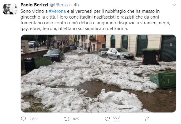 Berizzi, commentando il nubifragio, scrive su Twitter: “Sono vicino a Verona e ai veronesi per il nubifragio che ha messo in ginocchio la città. I loro concittadini nazifascisti e razzisti che da anni fomentano odio contro i più deboli e augurano disgrazie a stranieri, negri, gay, ebrei, terroni, riflettano sul significato del karma”.