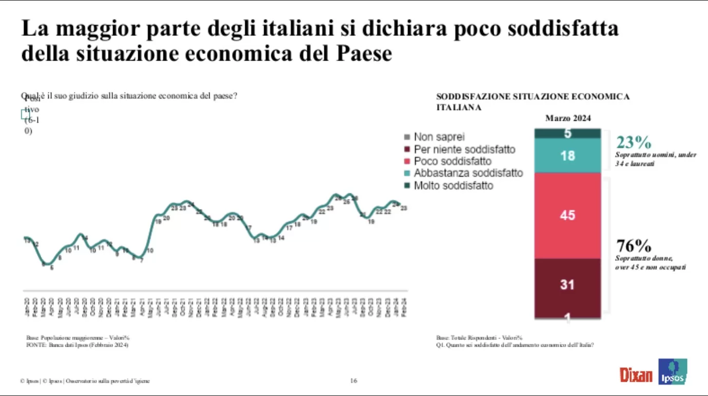 Ma non sono tutte rose e fiori nell’economia italiana. Il 50% dei nostri connazionali non è soddisfatto della propria condizione economica attuale e il 33% non saprebbe far fronte a spese impreviste (di mille euro o superiori). Questi i numeri emersi dalla ricerca Ipsos che ha intervistato i nostri connazionali tra 18 e 65 anni. Quando si parla di povertà assoluta ci si riferisce a un contesto in cui le persone lottano per soddisfare i bisogni fondamentali come il cibo e l’acqua, la povertà relativa invece quando esiste un divario economico rispetto alla media della società. Esiste inoltre il concetto di povertà multidimensionale che include diversi fattori che influenzano la qualità della vita. Se è vero che la percezione individuale di essere poveri dipende dalle aspettative personali, è altrettanto vero che vi sono fattori oggettivi che giocano un ruolo fondamentale nell’identificazione della povertà, come la disponibilità e l’accesso a servizi come sanità, istruzione, trasporti pubblici, acqua potabile e igiene.