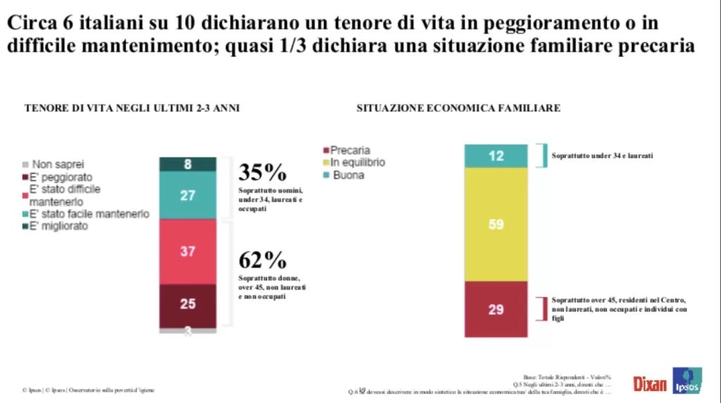 Nel 2022 erano in condizione di povertà assoluta poco più di 2,18 milioni di famiglie (8,3% del totale in crescita dal 7,7% nel 2021), secondo i dati Istat. Ovvero oltre 5,6 milioni di individui (9,7% in crescita dal 9,1% nel 2021). Peggioramento imputabile all’accelerazione dell’inflazione. La povertà assoluta è meno diffusa al Nord e al Centro rispetto al Mezzogiorno, dove famiglie e individui faticano maggiormente a soddisfare i bisogni essenziali. Una situazione che spaventa soprattutto le donne: 2 italiani su 3 affermano che il paese non ha margine di miglioramento. Disaggregando il 64% che ha espresso questa opinione, si scopre che è composto in larga parte da donne, 35-44enni e non occupati. La percentuale di famiglie in povertà di igiene, ovvero nell’impossibilità di permettersi le spese relative all’igiene personale e dei propri indumenti, si attesta tra l’1% e il 10% della popolazione. Solo il 15%, tra i più giovani e sensibili alle tematiche sociali, dichiara di conoscere molto bene il tema.