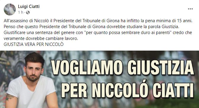 Su Facebook il padre di Niccolò, Luigi, ha utilizzato parole durissime: “Penso che questo presidente del Tribunale di Girona dovrebbe studiare la parola giustizia. Giustificare una sentenza del genere con “per quanto possa sembrare duro ai parenti” credo che veramente dovrebbe cambiare lavoro. Continueremo a lottare per darti quella giustizia che meriti Niccolò – ha scritto Luigi Ciatti pubblicando una foto del figlio – ci troviamo di fronte persone che dovrebbero essere dalla nostra parte ma che invece sono al fianco degli assassini. Siete la vergogna di un mondo civile, quando tornate a casa avete il coraggio di guardare negli occhi i vostri figli?”.