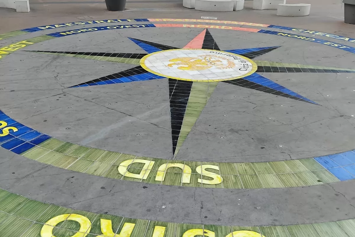Questo luogo, sopra una rosa dei venti disegnata sul basolato, al calar del sole ospita nugoli di ragazzini, con magliette disparate, che giocano a calcio usando le panchine come porte. Sono di razze, etnie, provenienze diverse. Cinesi, bangla, filippini, srilankesi, tunisini, e autoctoni del quartiere Borgo Vecchio, una borgata popolare in pieno centro città prospiciente il Porto. Non c’è un campetto dove giocare in questo quartiere, ce n’era uno ma è andato diruto, come molti luoghi cittadini, per carenza di manutenzione ed incuria. Ci sono altri sport esercitati al Borgo, come le corse clandestine dei cavalli, che vengono tenuti nascosti qui, tra baracche e garage, di vicoli dove non passa lo straniero.