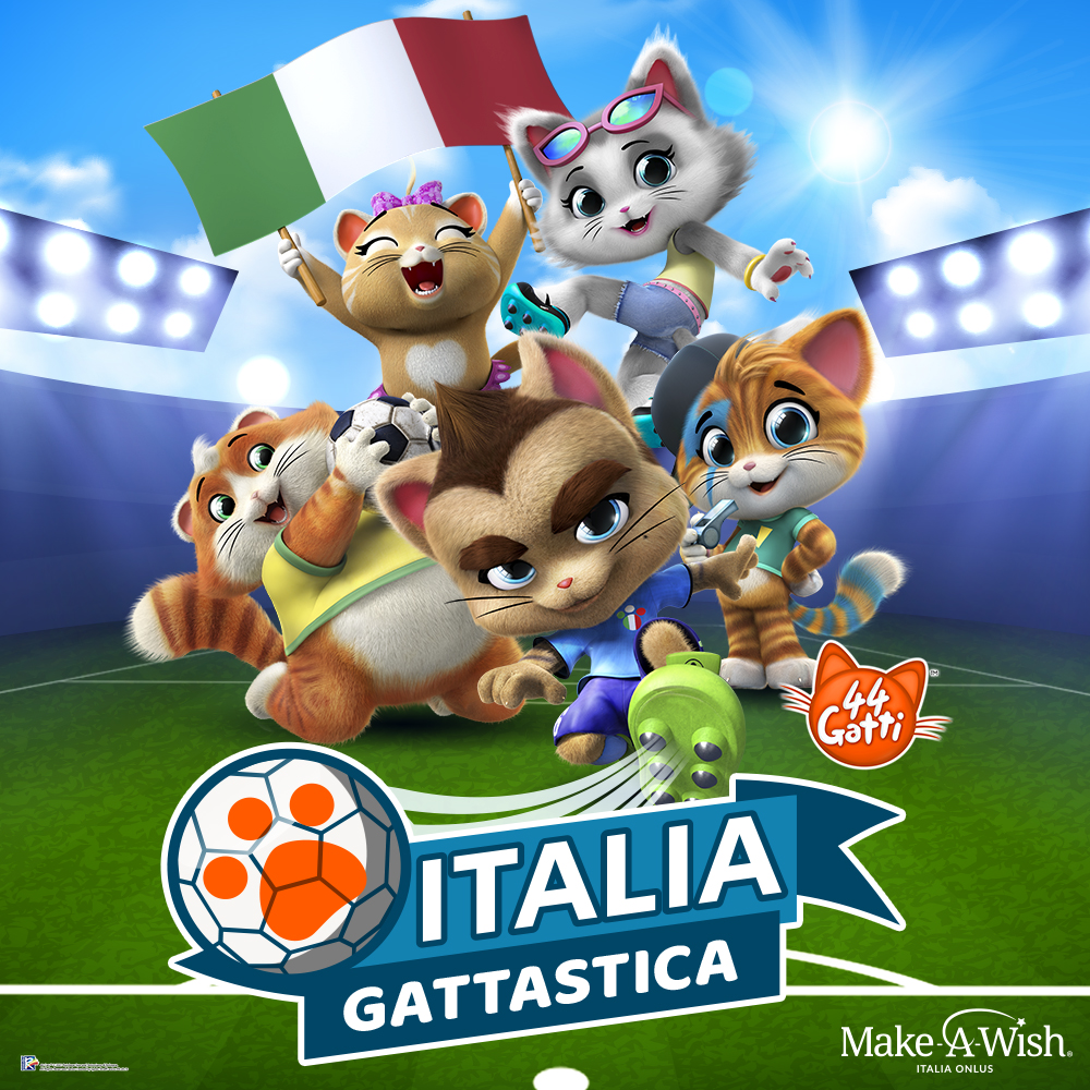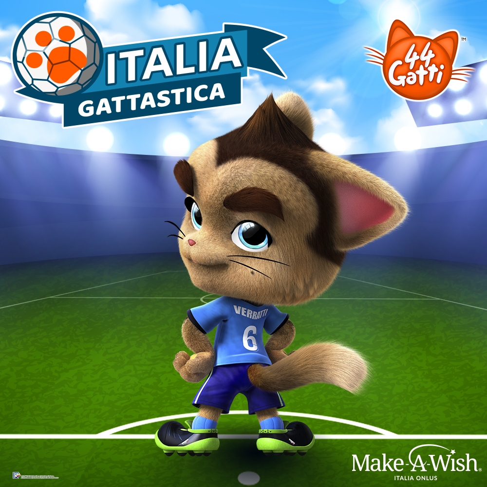 Il campione gattizzato personalizzerà una bandiera del nostro Paese per tifare Italia, in compagnia di Lampo, Milady, Pilou e Polpetta in una inedita versione sportiva. Il ricavato dalla vendita della bandiera italiana in edizione limitata sarà devoluto in beneficienza a Make-A-Wish Italia Onlus che realizza i desideri del cuore dei bambini gravemente malati (www.makeawish.it). Tutte le informazioni sul sito ufficiale di 44 Gatti www.44gatti.it