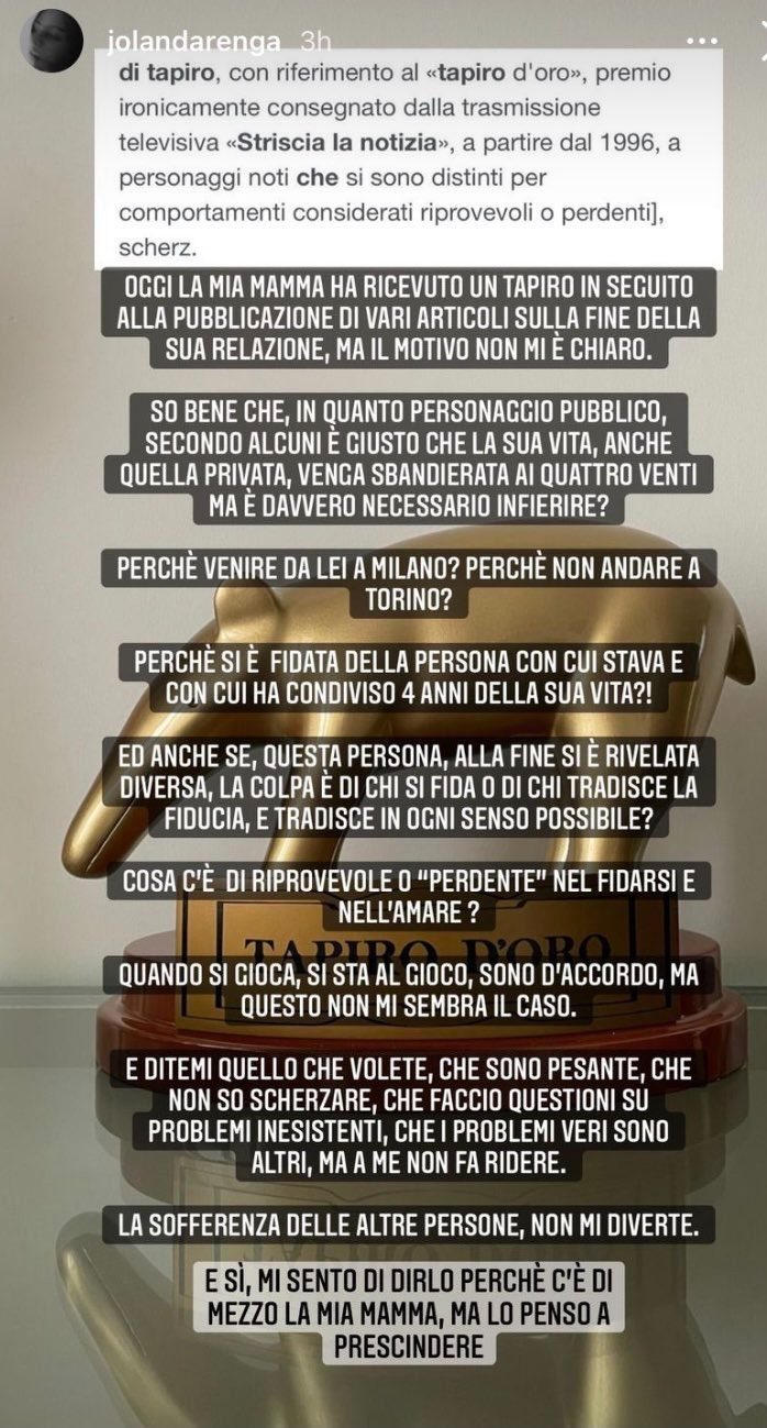 Un duro attacco è invece arrivato dalla figlia 17enne di Angiolini, Jolanda Renga , che in maniera precisa e puntuale difende la madre, ponendo l’accento sui suoi sentimenti. E poi rilancia una riflessione: “Perché si è fidata della persona con cui stava e con cui ha condiviso 4 anni della sua vita? Ed anche se questa persona alla fine si è rivelata diversa, la colpa è di chi si fida o di chi tradisce…?” E poi aggiunge: “Cosa c’è di riprovevole o perdente nel fidarsi e nell’amare? Quando si gioca, si sta al gioco, sono d’accordo, ma questo non mi sembra il caso“.