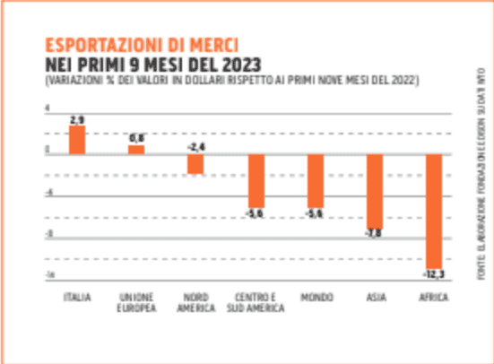 In base alle ultime statistiche WTO disponibili, nel corso del terzo trimestre la situazione è ulteriormente peggiorata, con un calo dell’export mondiale di merci in dollari rispetto al terzo trimestre 2022 del 7,6%, che ha portato la flessione complessiva rilevata nei primi nove mesi del 2023 a -5,6%. Le più forti cadute delle esportazioni in valore nei primi tre trimestri del 2023 hanno riguardato l’Africa (-12,3%) e l’Asia (-7,8%), mentre in questo contesto complicato l’Italia, pur rallentando, è riuscita a mantenere una lieve crescita (+2,9%), facendo meglio di tutte le aree mondiali.