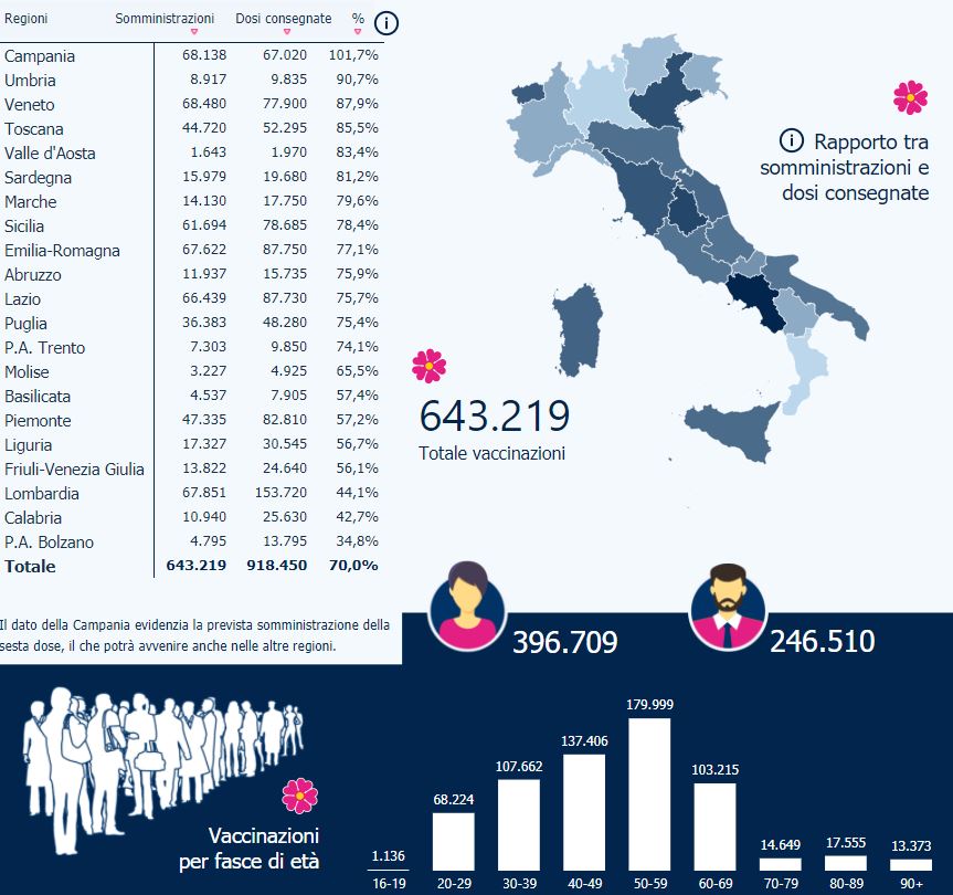 Non c’è trucco, non c’è inganno. La Campania ad oggi è la prima regione italiana ad aver somministrato tutte le dosi del vaccino anti-Covid ricevute dalla struttura commissariale guidata da Domenico Arcuri. Un risultato arrivato grazie al fortissimo impegno del personale sanitario campano, nonostante le polemiche per le code del week end alla Mostra d’Oltremare, dove è stato allestito il Covid Vaccine Center dell’Asl Napoli 1.