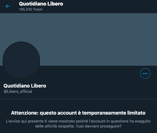 Come già detto, la sospensione di Libero non è simile a quella di Trump: attualmente infatti l’account non è visibile, ma è comunque possibile per gli utenti visualizzare la sua timeline cliccando sul tasto di accettazione che prevede l’opzione di mostrare il profilo.