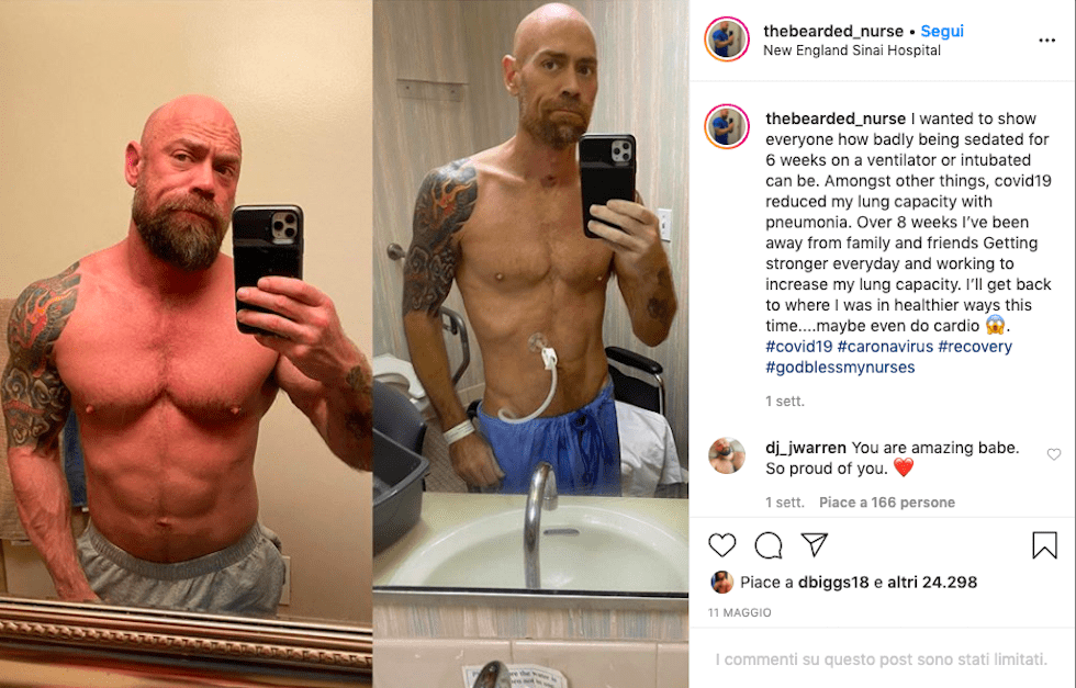 “Volevo mostrare a tutti quello che significa essere sedato o intubato per sei settimane con un ventilatore. Tra le altre cose, il covid-19 ha ridotto le capacità del mio polmone per pneumonia. Per oltre otto settimane sono stato lontano dalla mia famiglia”, ha scritto l’infermiere sul social.