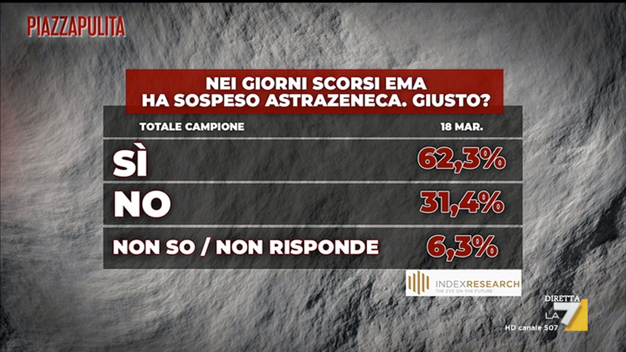A proposito di Ema, proprio ieri Piazza Pulita è incappato in un errore da matita blu. Nel corso della trasmissione condotta da Corrado Formigli si dà spazio ai consueti sondaggi di IndexResearch, con una domanda che però contiene una bufala già nella sua formulazione. “Nei giorni scorsi Ema ha sospeso AstraZeneca, è giusto?” è la domanda posta agli intervistati.