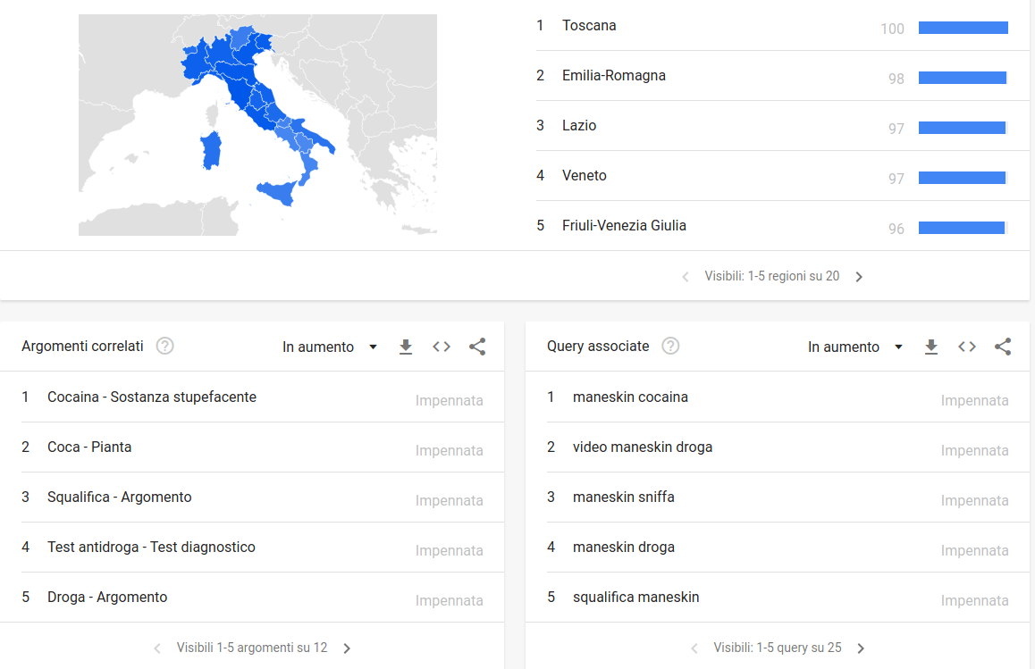Su Twitter, il post ufficiale della Band ha totalizzato 75 mila mi piace, altrettanti circa sul post di Facebook pubblicato dalll’organizzatore Eurovision. Sempre sul social di Zuckerberg, il post della pagina Maneskin ha guadagnato 90 mila like che su Instagram ha invece raggiunto ben 1,2 milioni di mi piace con totali 3 milioni se consideriamo i tre post celebrativi della vittoria. E google invece? “Big G riporta la classifica dei trends a livello italiano con la Toscana in testa tra le regioni del Bel Paese, ma quello che sorprende – conclude Varriale – è la mole di ricerche che, tra argomenti correlati e ricerche precise, associa i Maneskin alla droga. Che i francesi abbiano fatto una pessima figura anti italiana come al solito è chiaro, ma che questo accadimento abbia dato una ulteriore spinta alla band è un dato di fatto”.