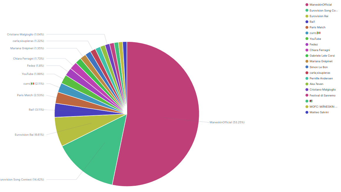 La classifica delle menzioni è interessante se consideriamo che ad aver avuto la meglio nella top20, oltre al profilo ufficiale della Band e dei vincitori, c’è quello della rete ammiraglia RAI1 e della testata francese Paris Match che si è contraddistinta per la polemica sorta sulla presunta sniffata in diretta di Damiano, smentita dalla stessa organizzazione dell’Evento. Sdegno ed insulti hanno ricoperto i francesi che addirittura hanno invocato la sospensione della vittoria italiana previo test antidoping, arrivato nella serata di lunedì con risultato negativo. La vera sorpresa però è la coppia Ferragni – Fedez che si posiziona all’ottavo ed il settimo posto. “molto interessante la famiglia Ferragni che ha provato a soffiare il posto ai Maneskin in quel di Sanremo, con lo scandalo del televoto che ha proiettato Fedez dal decimo al secondo posto -spiega Varriale -. Ancora più interessante se consideriamo che non hanno mai pronunciato la parola Maneskin nei loro tweets, seppur hanno invitato i cittadini del mondo, per la Ferragni, e quelli italiani, vedi fedez, a votare con gli hashtag dell’evento. Più che onorare i Maneskin, hanno voluto far pesare la loro forza per mettere quel cappello su una vittoria che avrebbero desiderato portare in casa propria”. In classifica anche Cristiano Malgioglio ed il Festival di Sanremo. Immancabile Matteo Salvini, bersagliato anche questa volta dalle critiche del pubblico.