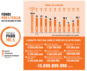 Bene: a fronte di 67 miliardi già incassati (governo Draghi), il governo Meloni deve ancora incassarne uno su un totale di 36 previsti entro la fine del 2023. Ma il dato che fa più male è che di questi 36 previsti, ben 15 miliardi e 891 sono stati definanziati. Il ministro Fitto e la premier Meloni insistono che non è vero, dicono che “questi soldi sono stati spostati da progetti che non sarebbero mai stati realizzati nei tempi previsti” (collaudo entro giugno 2026).