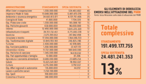“La maggior parte delle amministrazioni, comunque, ha registrato un livello di spesa inferiore alle previsioni che denota un ritardo nella fase di definizione e avvio delle misure che potrebbe incidere sulla effettiva realizzazione dell’intero Piano con particolare riferimento al pieno raggiungimento degli obiettivi finali” si legge nella bozza della Relazione. Il ministero delle infrastrutture e dei Trasporti con 39 miliardi di euro di risorse è l’amministrazione centrale che gestisce oltre il 20 per cento delle risorse totali previste dal PNRR e ha registrato un livello di spesa al 12 per cento. Il Ministero dell’ambiente e della sicurezza energetica è responsabile di 34 miliardi pari al 18 per cento del piano e ha fatto registrare una spesa del 25 per cento, tale risultato è imputabile al Sismabonus ed Ecobonus.