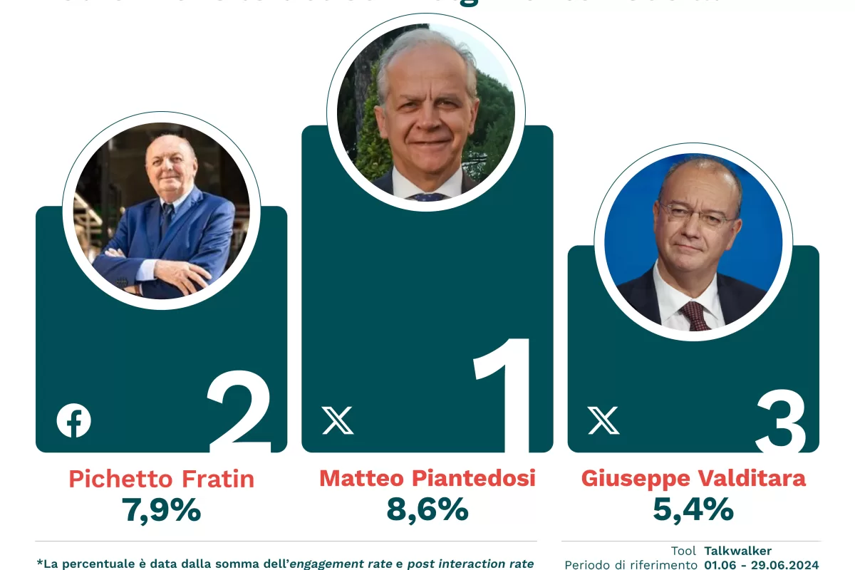 Su Instagram invece, comparando sempre luglio su giugno, possiamo registrare l’ottima performance del ministro dell’Ambiente, Gilberto Pichetto Fratin, del ministro per gli Affari Europei, Raffaele Fitto e di quello dello Sport, Andrea Abodi. Mentre, perdono qualche punto percentuale nella classifica del coinvolgimento sia il ministro degli Esteri, Antonio Tajani, che quello dell’Interno Matteo Piantedosi. Mentre, è l’altro vice premier e Ministro dei Trasporti, Matteo Salvini a prendersi con 170 contenuti, la vetta della classifica per il maggior numero di post pubblicati. Su X a calamitare in modo consistente l’attenzione dei follower è stato il ministro dell’Interno, Matteo Piantedosi che con il 6,8% ha incassato la percentuale più ampia di engagement e il ministro dell’Agricoltura, Francesco Lollobrigida che con il 3,0% ha ottenuto la percentuale più consistente di interazione al post.