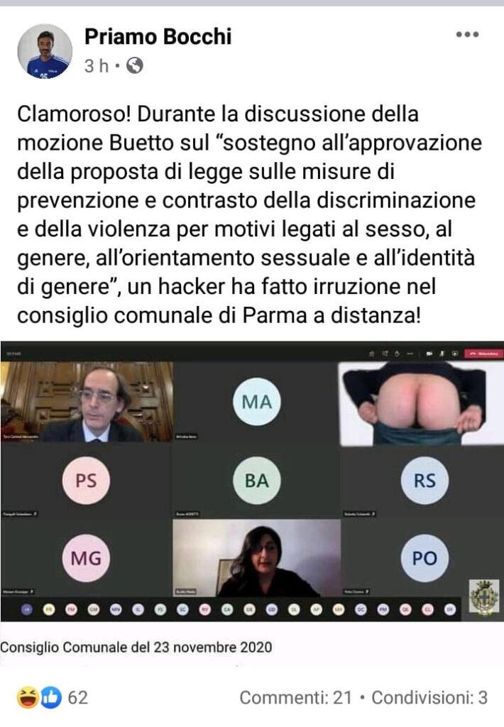 Ha mostrato un sedere, tramite un fotomontaggio, mentre il Consiglio comunale di Parma convocato in streaming su Zoom discuteva una mozione contro le discriminazioni di genere e le violenze legate al sesso. A denunciare il “gesto vergognoso” avvenuto durante la riunione di lunedì è stato il sindaco della città ducale, l’ex grillino Federico Pizzarotti, mentre sul banco degli imputati c’è Priamo Bocchi, coordinatore di Fratelli d’Italia a Parma.
