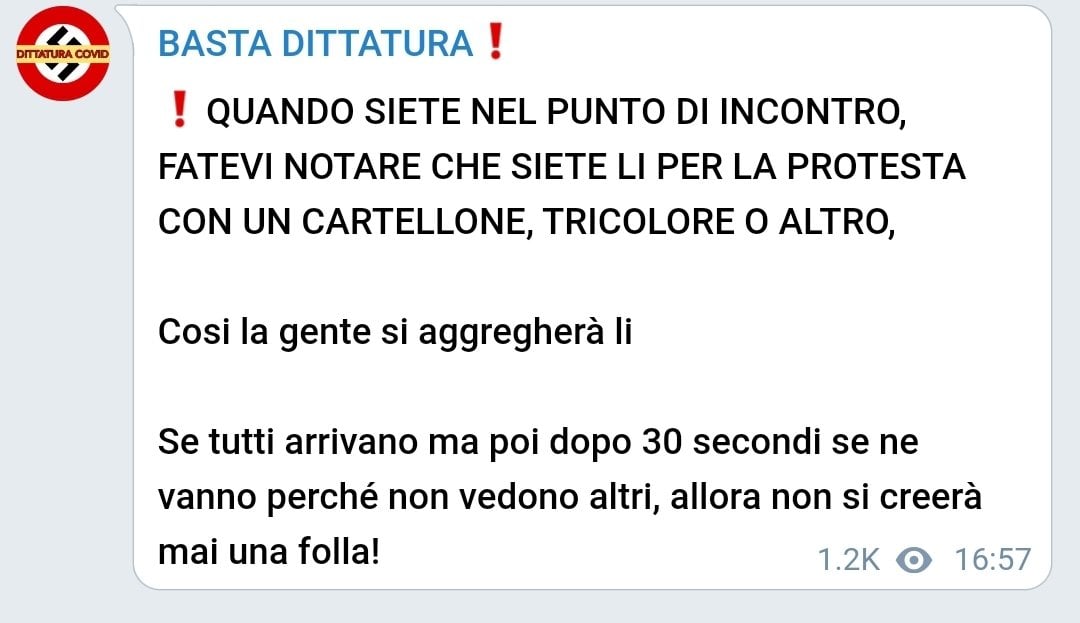 DELUSIONE TRA GLI ORGANIZZATORI – Chat piene ma piazze vuote, attualizzando una celebre frase. E la delusione tra gli organizzatori è evidente. Sulle chat Telegram, in particolare nel gruppo ‘Basta dittatura’, sono gli amministratori a evidenziare tutto il loro disappunto: “Se tutti arrivano ma, dopo 30 secondi vanno via perché non vedono altri, allora non si creerà mai una folla”, è il ‘rimprovero’ agli iscritti.