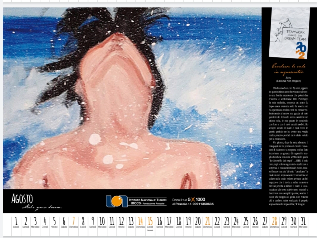 Da questa mattina sul sito dell’Istituto dei tumori di Napoli è attivo il link (http://newportal.istitutotumori.na.it/lo-sportello-dei-sogni/) per lasciare un sogno sospeso per un paziente. Intanto l’associazione di Fiorangela venderà i calendari attraverso i suoi canali on line e nelle piazze. Il ricavato della vendita servirà ad esaudire i desideri espressi dagli ammalati. Il calendario non a caso si intitola Teamwork makes the dream team, che tradotto, significa: il lavoro di squadra fa la squadra dei sogni.
